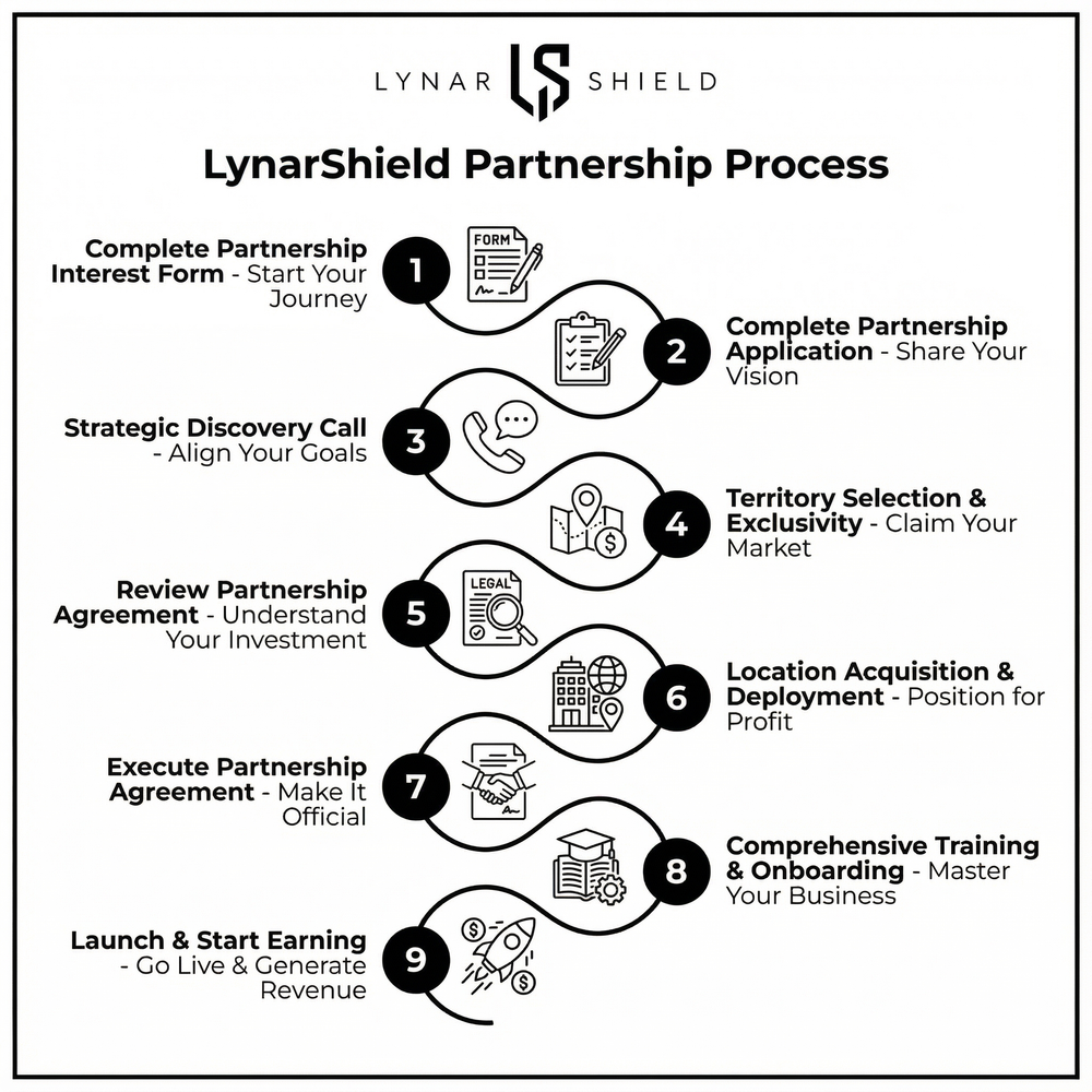 Det er enklere end du tror at opbygge dit automatiserede detailimperium. Ingen franchiseafgifter. Ingen royalties. Kun rent ejerskab og profitpotentiale. Gennem vores strømlinede partneropdagelsesproces afgør vi, om LynarShield er den rette mulighed for at opbygge formue for dig, og om du er den rette partner for os.